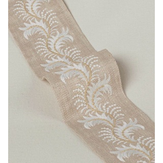 Andorra Braid Beige is from the Mirador Trimmings collection by Colefax and Fowler. A beautifully embroidered all-over ogee trellis adorns the Andorra Braid which is densely patterned with a combination of stitchwork techniques. Medium in scale, its design is accented by a corded applique stripe that runs in parallel along both edges.