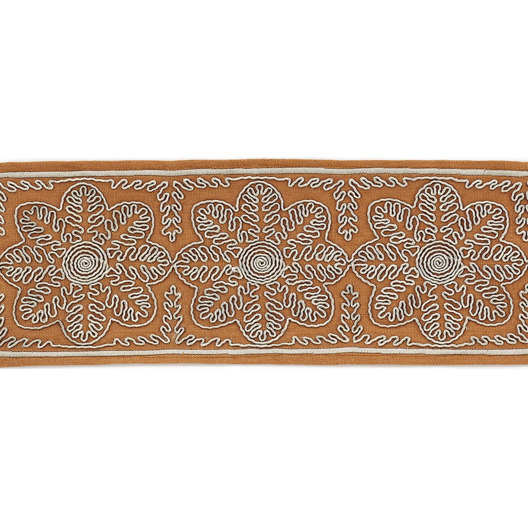 An innovative decorative braid with intricate corded embroidery that forms stylised floral motifs on wide linen bands. An elegant addition to the Theodore Trimmings collection, as the linen braid colours are easily compatible with the range.