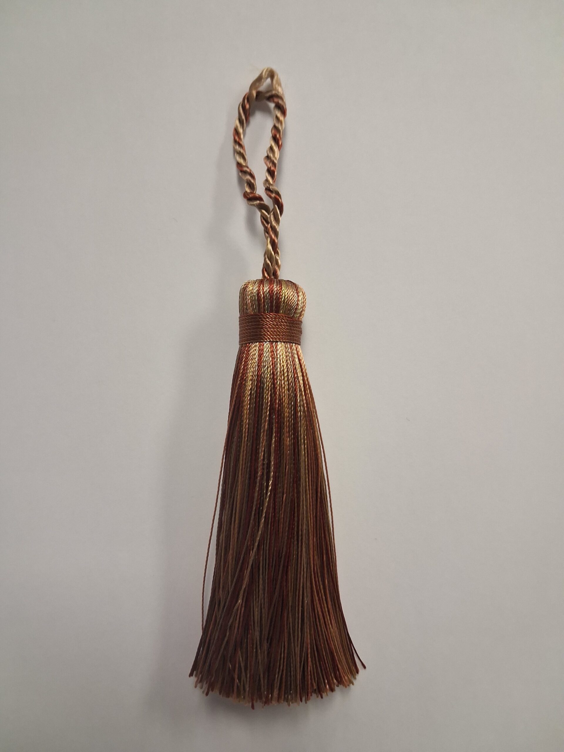From a richly gold collection this key tassel is 9cm, excluding hanging loop. The hanging loop is 6cm long.