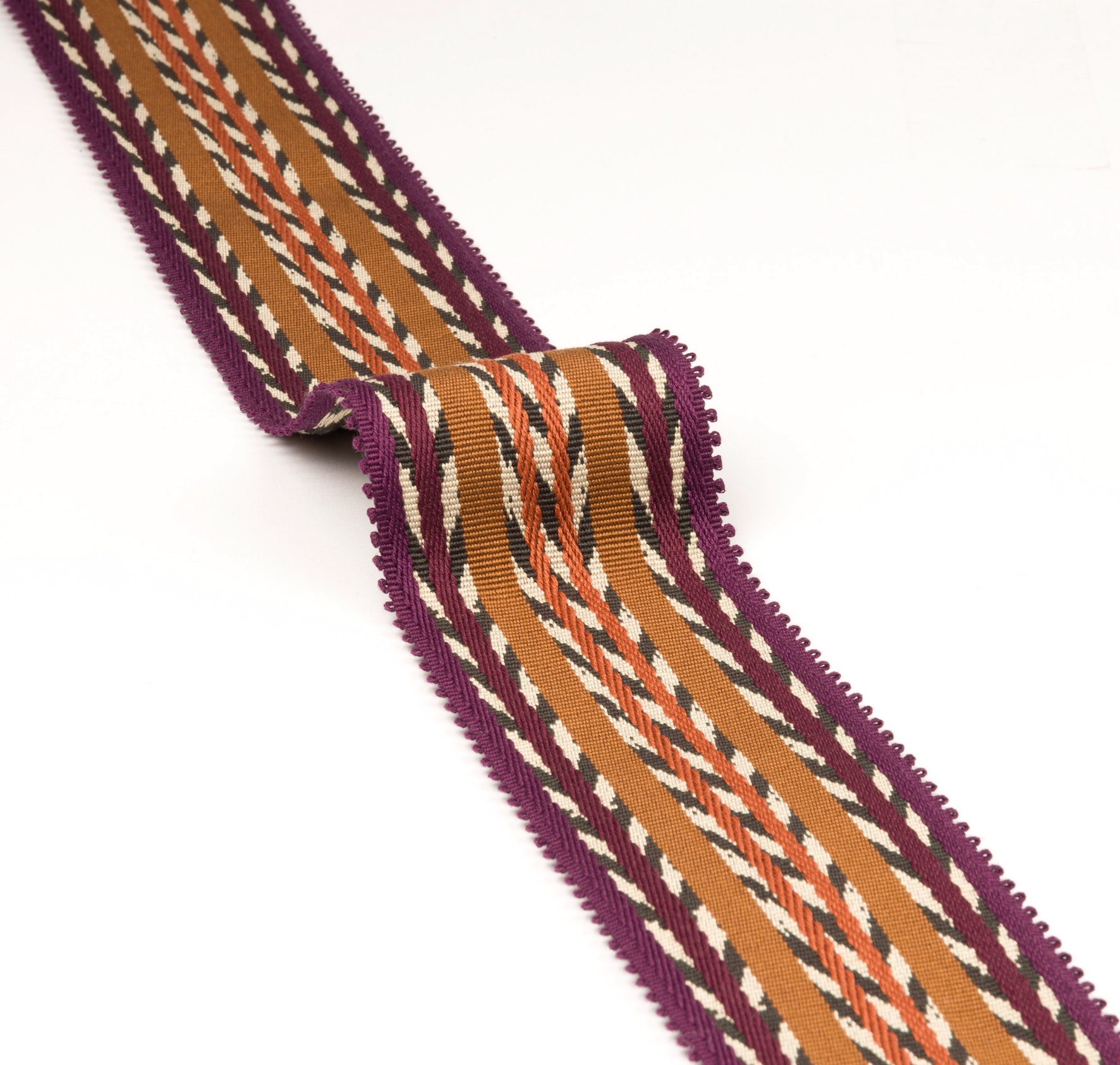 Inspired by traditional Guatemalan textiles, this jacquard woven tape presents a dynamic ikat stripe rhythm framed by a delicate knotted border, with a supple and soft texture.