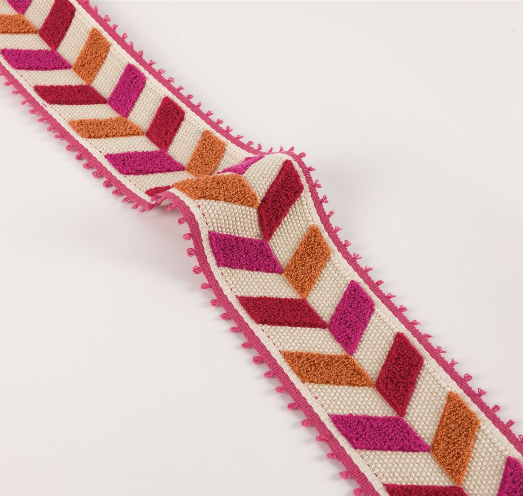 A striking woven braid with delicately knotted edges displaying a bold embroidered chevron pattern with a generous loop offering dimension and texture.