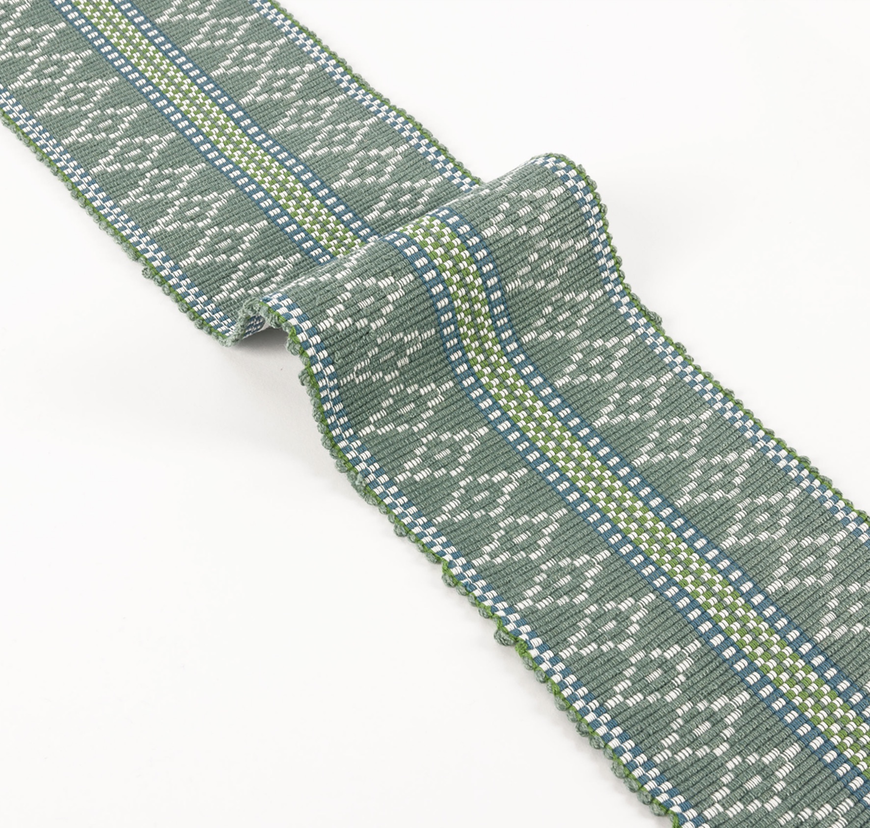 A wide woven ribbed tape displaying intricate diamonds and small checkers with a South-American inspiration. Colourful with a hand woven and natural look.
